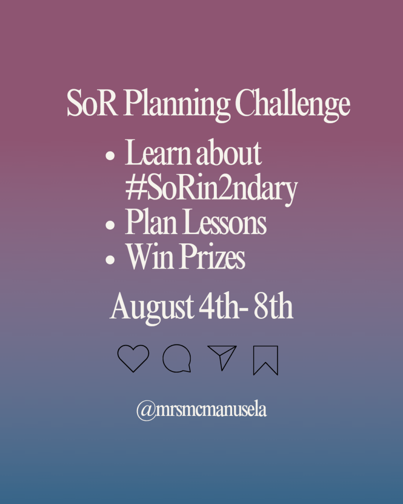 As you are learning about SoR and planning your reading unit, you can also earn prizes from our amazing sponsors. Daily participation prizes are being offered by Designed for You Tumblers, Shop Teacher Ts, Chans Lans and your host,Mrs. McManus ELA. Grand prizes, for completing the challenge and sharing about the challenge on social media, are sponsored by Markers and Minions and Mrs. McManus ELA.